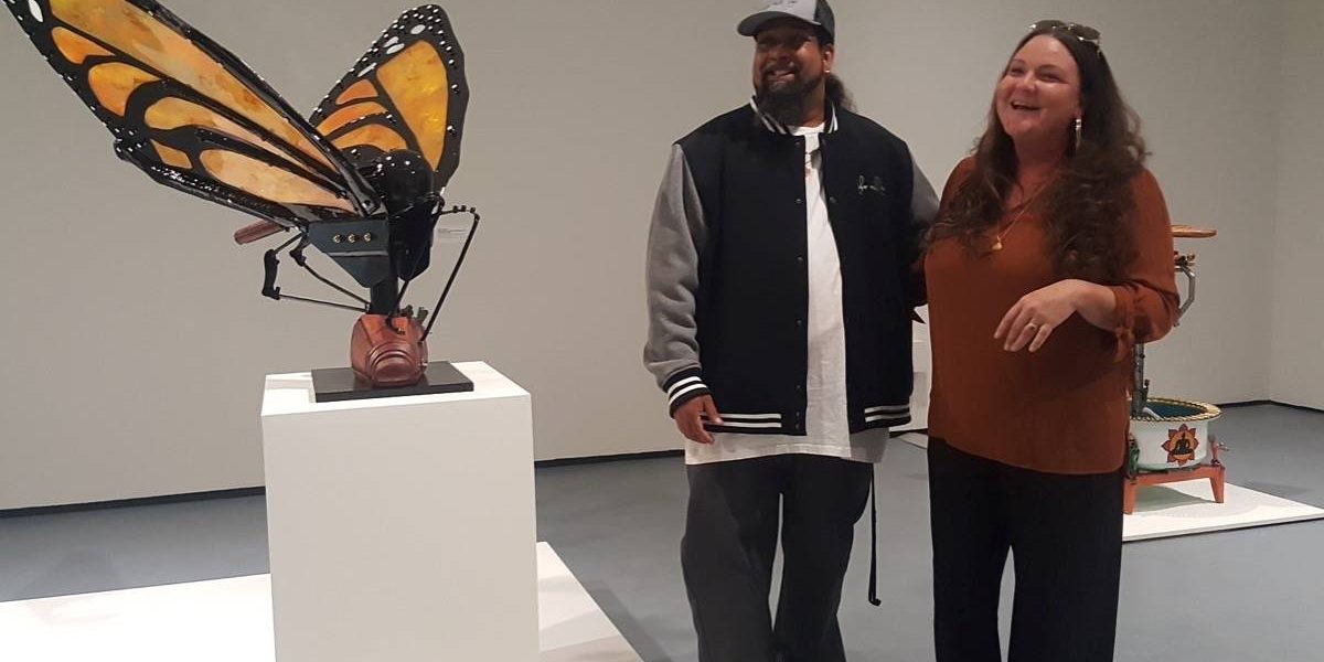 “Resurrection,” a big, graceful butterfly made with rifle and shotgun barrels and poured resin mixed with ground-up 9mm bullets, was created by El Sobrante designers Natasha and Ali. It’s the third collaboration between the married couple, who call their collective Labor and Love, and the Robby Poblete Foundation.